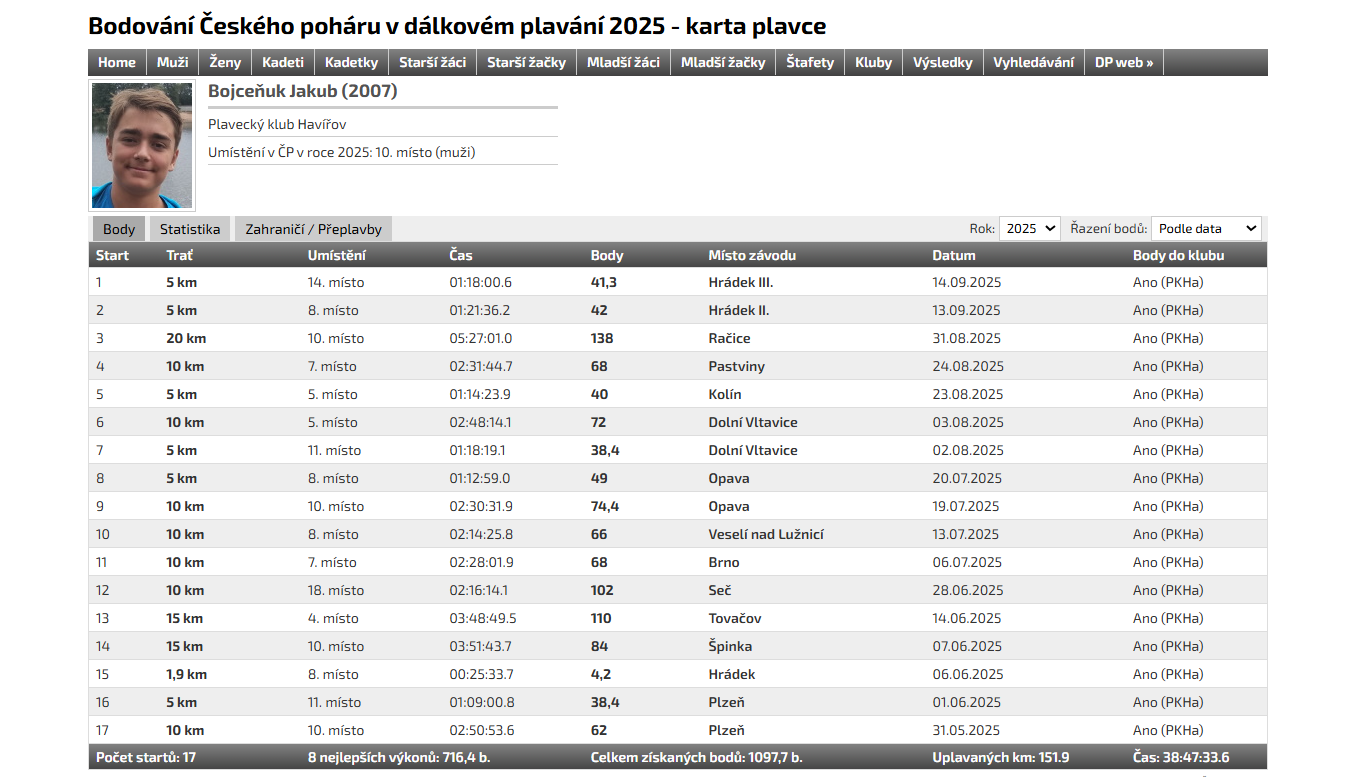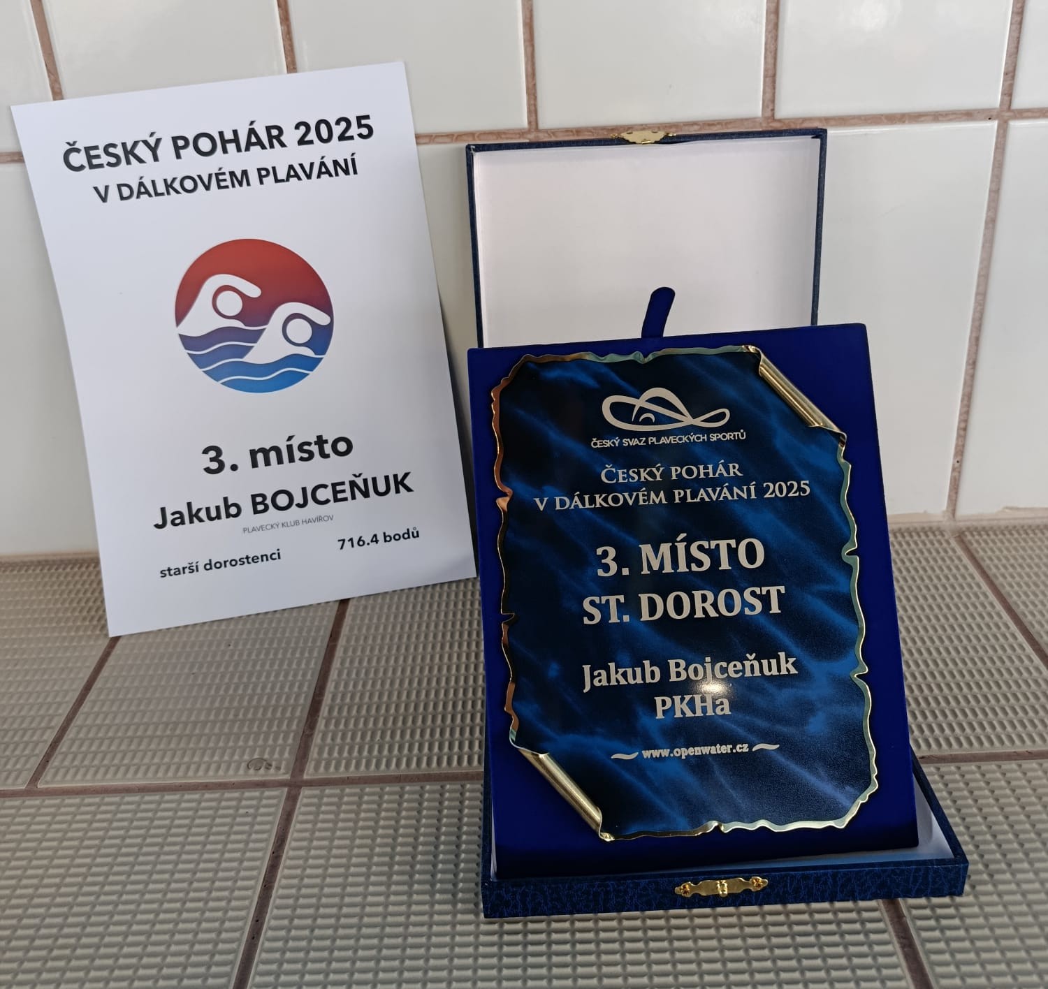 Jakub si převzal plaketu za 3. místo v kategorii starší dorost v Českém poháru 2025 v dálkovém plavání. Zúčastnil se celkem sedmnácti závodů v průběhu celé dálkoplavecké sezóny. Odstartoval 31.5.2025 prvním závodem na deset kilometrů v Plzni na Boleváku a zakončil to 14.9.2025 pětkou na Hrádku ve Starých Ždánicích u Pardubic.