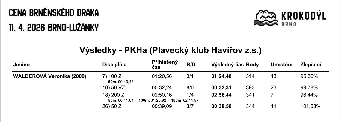 Dne 18. dubna se Veronika Walderová vypravila jako jediný zástupce našeho klubu na Aprílovou vlnku do Znojma. Na programu měla čtyři starty. Začala 50m motýlek, kde si vylepšila svůj nejlepší čas a zaplavala to za 35,03