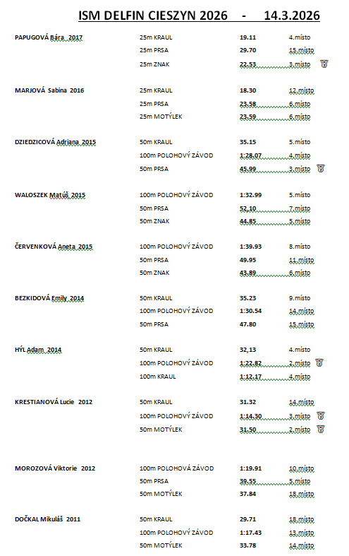 V sobotu 14. března 2026 se mladí plavci z Plaveckého klubu Havířov zúčastnili plaveckých závodů ISM Delfin Cieszyn, které se konaly v polském městě Cieszyn. Závody přilákaly  přes   500  talentovaných  plavců ze 44 klubů a nabídly napínavé sportovní souboje i mnoho osobních rekordů.