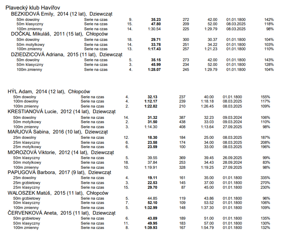 Velmi solidní výsledky zaznamenali i další členové týmu. Sabina Marjová obsadila 12., a 2 x 6. místo, Matúš Waloszek skončil na 5., 7. a 5. místě a Aneta Červenková doplavala na 8., 11. a 5. místě. Emily Bezkidová vybojovala 9., 14. a 15. místo. Další závodníci také sbírali cenné zkušenosti – Viktorie Morozová skončila na 10., 5. a 18. místě a Mikuláš Dočkal obsadil 18., 13. a 14. místo.