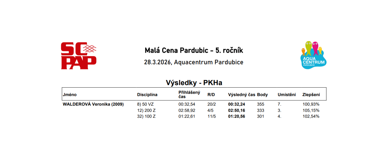 V sobotu 28. března se na plaveckých závodech v Pardubicích představila i naše plavkyně Veronika Walderová, která zaznamenala několik pěkných výsledků. Na trati 50 m volný způsob obsadila 7. místo, ve své silnější disciplíně 200 m znak vybojovala skvělé 3. místo a na 100 m znak skončila těsně pod stupni vítězů na 4. místě. Veronika si závody velmi užila – panovala zde skvělá atmosféra a plavalo se jí dobře. I když se nevyhnula drobným chybám, ví, na čem zapracovat v tréninku a bude se snažit své výkony ještě vylepšit na příštích závodech. Velkou roli sehrála také podpora známých a přátel, díky kterým si celý závod ještě více užila. Třetí místo jí potěšilo a navíc si zaplavala osobní rekordy na všech tratích.