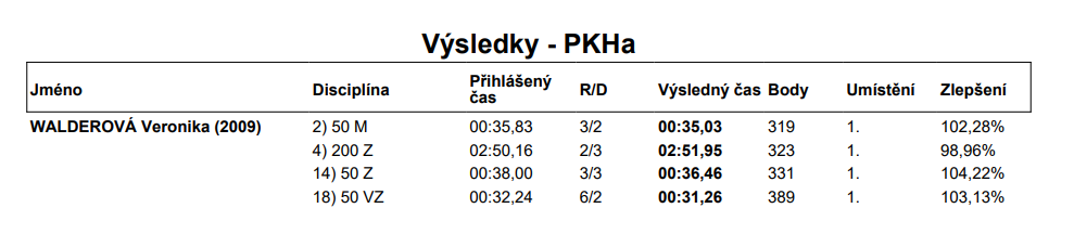 Aprílová vlnka – kraulový trojboj – Znojmo – 18.-19.4.2026 Publikováno 04/21/202621.4.2026 V kategorii Nezařazené Dne 18. dubna se Veronika Walderová vypravila jako jediný zástupce našeho klubu na Aprílovou vlnku do Znojma. Na programu měla čtyři starty. Začala 50m motýlek, kde si vylepšila svůj nejlepší čas a zaplavala to za 35,03 …